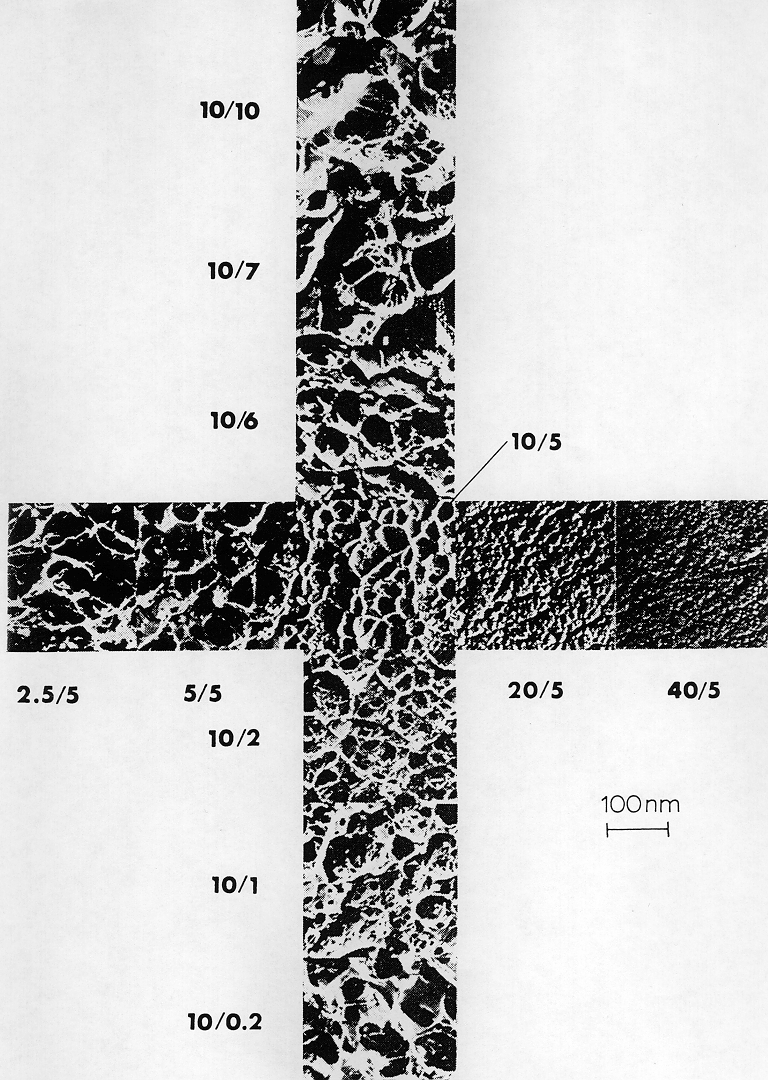 The gel matrix most commonly used for proteins separation is polyacrylamide. Polyacrylamide gels are formed when monomeric acrylamide is polymerized by the action of a radical forming agent, ammonium peroxidisulfate (ammonium persulfate) and N,N,N',N'-Tetramethylenediamine (TEMED). The gel forms optimally in the absence of free oxygen, since oxygen is a stable di-radical which can terminate the radical induced polymerization reaction. Since acrylamide polymerizes to long linear products, a cross-linker is required to form a three-dimensional gel. Bisacrylamide serves this function. Pore size within the gel is determined by both, the total acrylamide concentration (% T; = g acrylamide + g bisacrylamide per 100 ml) and the relative concentration of the cross-linker bisacrylamide (% C; = g bisacrylamide per 100 g (acrylamide + bisacrylamide). While pore size decreases with increasing T, small and large C-values yield large pores; the smallest pores are formed in the presence of approx. 5 % C, as seen in this electron micrograph.